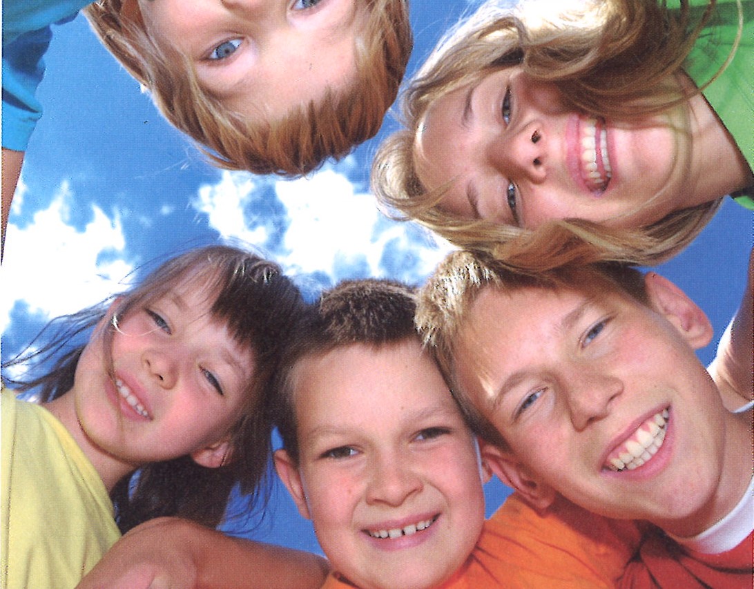 Fünf Kinder stehen im Kreis und schauen nach unten in die Kamera