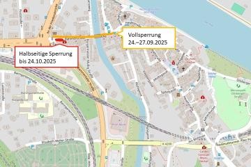 Vom 24. bis 27. September wird die Bahnhofstraße ab der Kreuzung B37/B45 bis zur Hauptstraße im Bereich Hanfmarkt für den Fahrzeugverkehr gesperrt. Fußgänger können die Baustelle passieren.