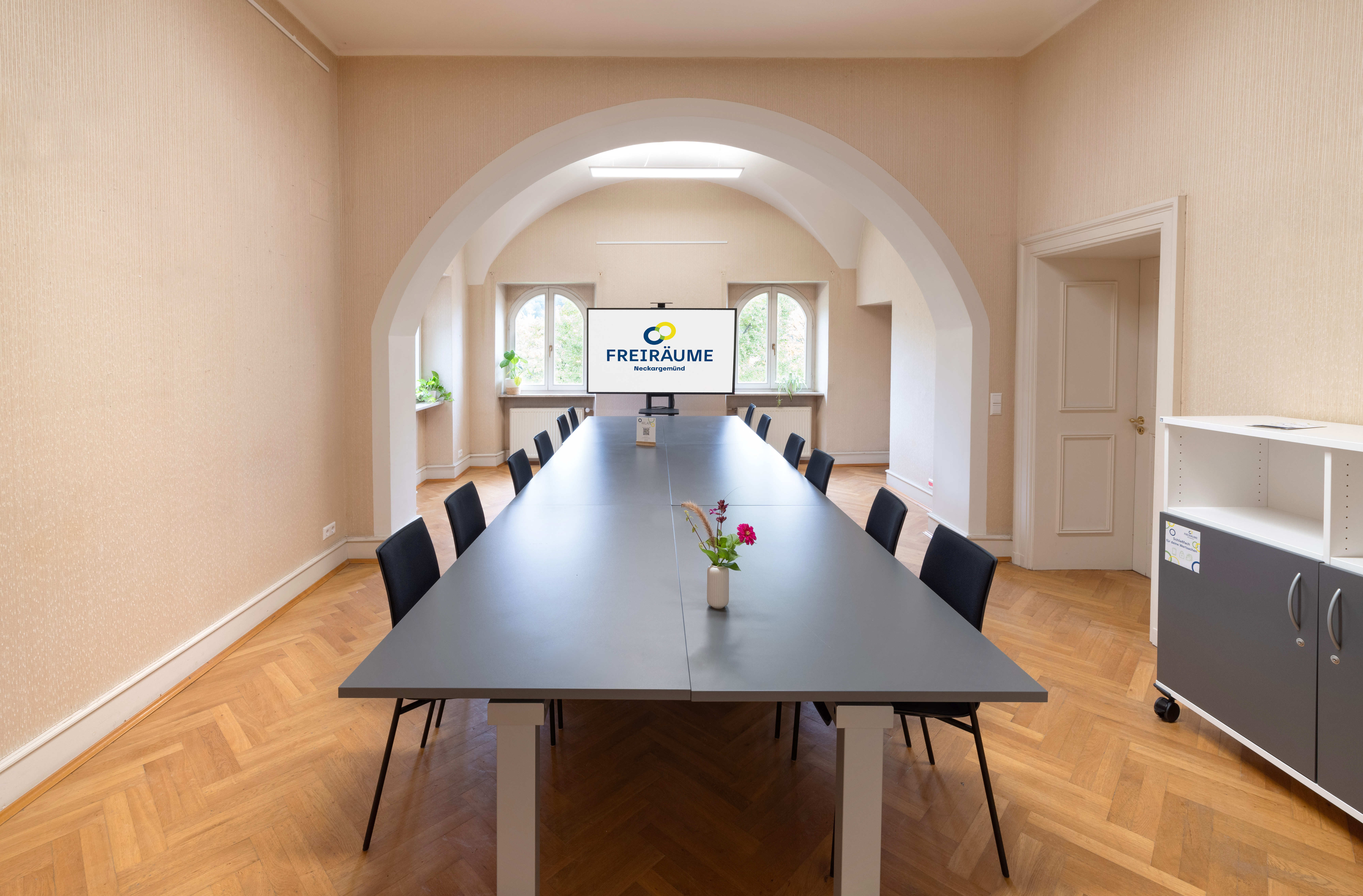 Der Raum bietet Platz für bis zu 14 Personen, wenn Sie Tische benötigen und ca. 25 Personen bei reiner Bestuhlung.
