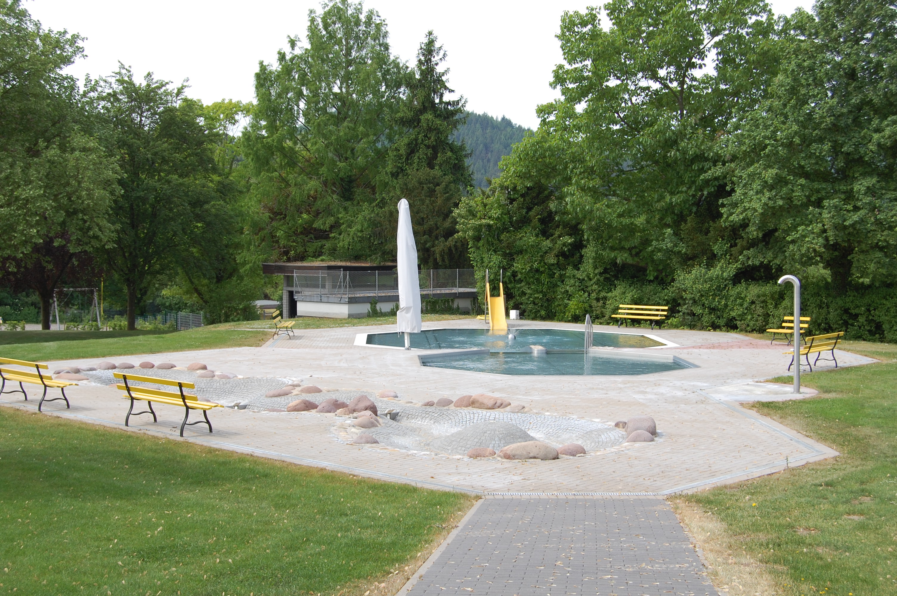 Der Kleinkinderbereich besteht aus zwei Planschbecken und einem Spielbach. Die Planschbecken sind über eine kleine Rutsche sowie eine Treppe verbunden. Ein großer Sonnenschirm schützt die Kleinen vor der Sonne.