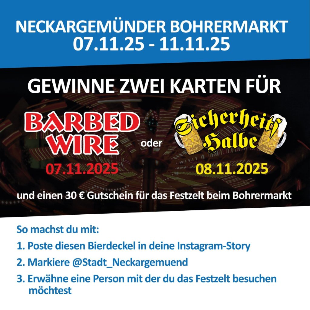 Am ersten Novemberwochenende geht es alljährlich rund in Neckargemünd: Bunte Fahrgeschäfte, Stimmung und gute Laune im Festzelt – der Bohrermarkt in Neckargemünd wird stets sehnsüchtig erwartet. Er ist das letzte Fest im Reigen der Jahrmärkte und Kerwen im weiten Umkreis. Im großen Festzelt unter der Friedensbrücke gibt es kulinarische Leckereien in bester Kerwe-Tradition. Zünftige bis rockige Musik und ein abwechslungsreiches Programm sorgen für Volksfeststimmung bei Jung und Alt. Auch die zahlreichen Verkaufsstände und Fahrgeschäfte sind bestens auf den Ansturm der Besucher gerüstet.