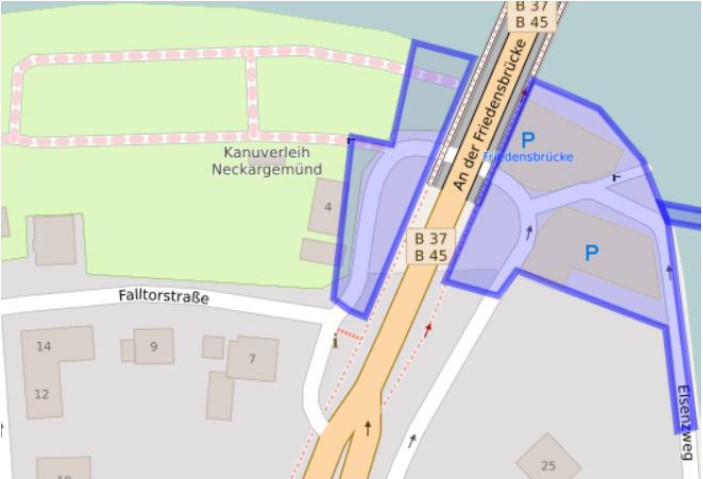 - Parkplatz „unter der Friedensbrücke“ ab Sicherheitskontrollstellen Falltorstr., Abfahrt am Martin-Luther-Haus und Zugang Elsenzweg.