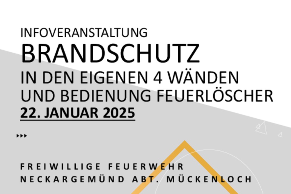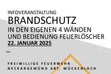 Nach den ersten Vorträgen und Workshops geht es am Mittwoch, den 22. Januar, um 19 Uhr im Sitzungssaal des Rathauses Mückenloch mit dem Thema „Brandschutz in den eigenen 4 Wänden“ weiter. Alle sind herzlich zu dieser Infoveranstaltung mit der FFW Neckargemünd Abt. Mückenloch eingeladen.