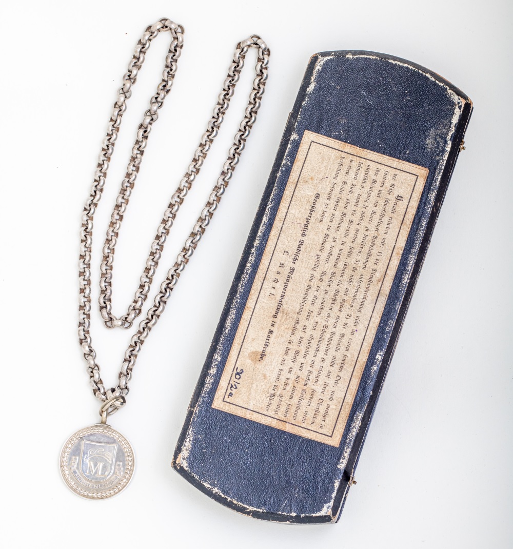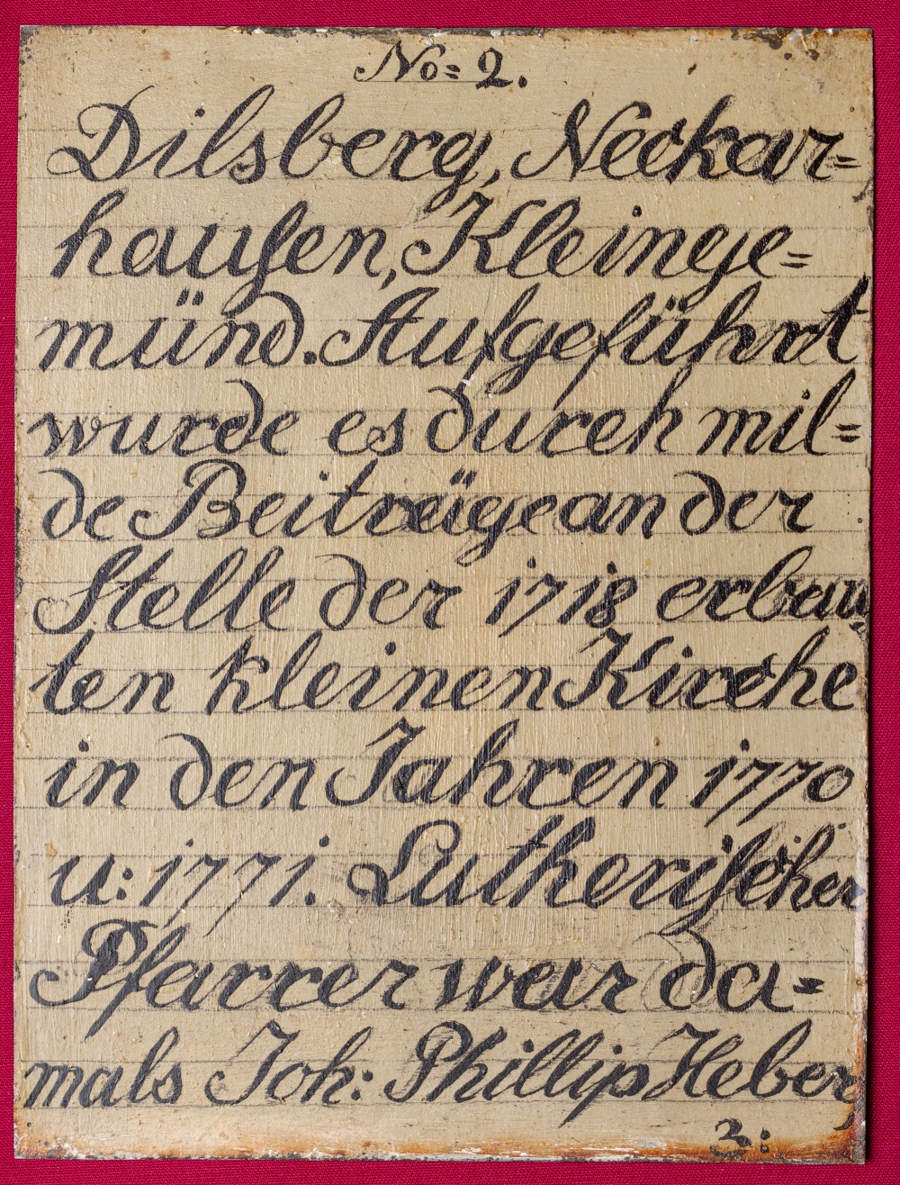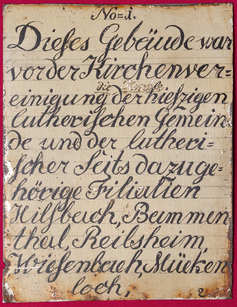 der Schatulle der Mückenlocher Amtskette, die Tipps und Hinweise für die fachgerechte Reinigung des guten Stücks bereithält. Oder erste Schreibübungen auf der Rückseite der Blechtäfelchen, die 1911 beim Umbau des Glockenturms im Alten Rathaus zum Vorschein kamen: Der Text auf der Vorderseite dokumentiert die Umwidmung des ehemaligen Kirchengebäudes zum Rathaus (1824) sowie weitere Umbaumaßnahmen aus den 1860er Jahren. Rückwärtig war der Text schon einmal zur Probe