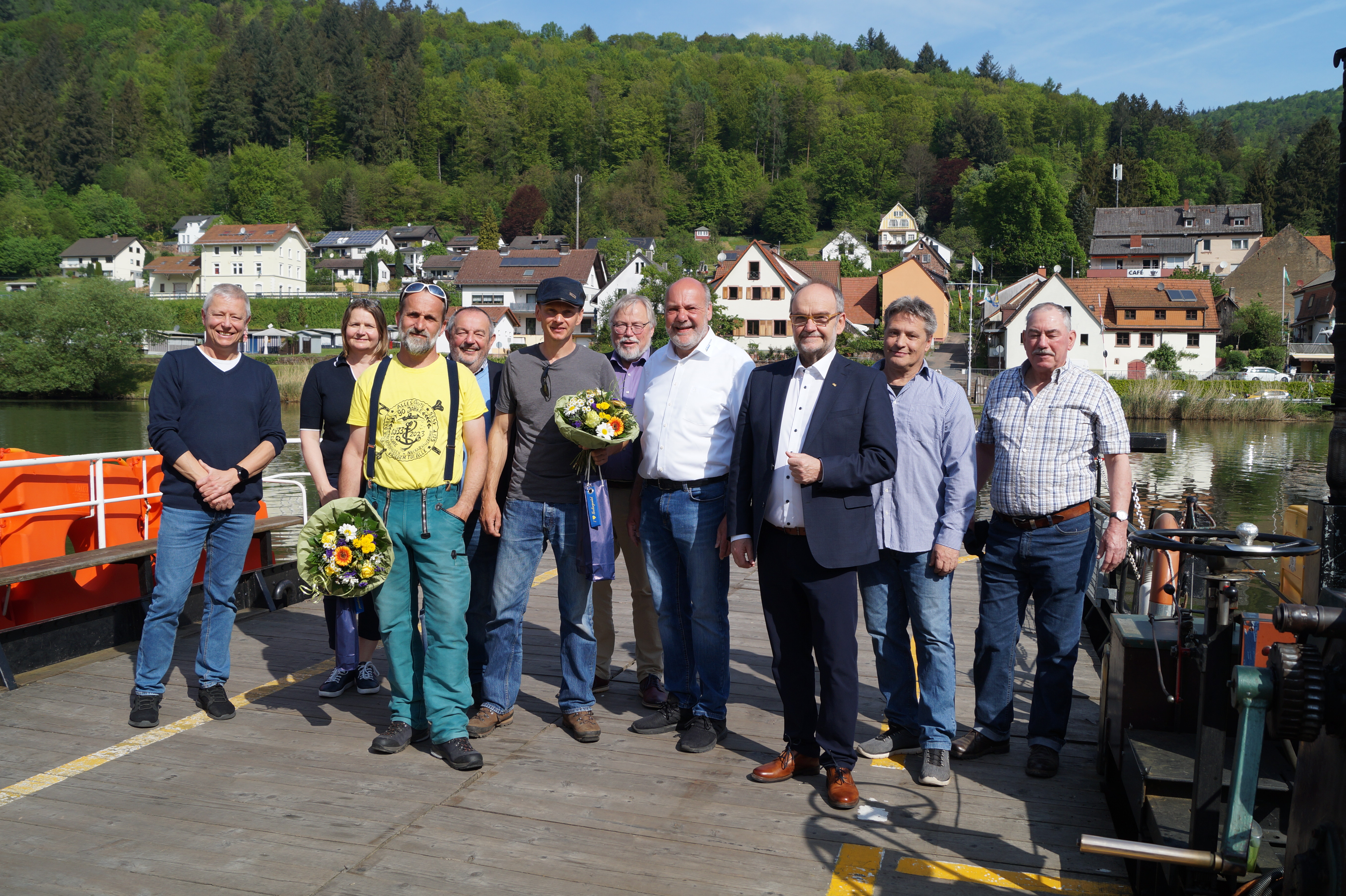Anfang Mai begrüßten Bürgermeister Frank Volk und Herold Pfeifer, Bürgermeister aus Neckarsteinach offiziell Alexander Deringer als neuen Fährmann auf der Fähre. Damit ist nicht nur der Fährbetrieb gesichert, sondern Markus Seibert, der ein Jahr lang alleine auf der Fähre war, hat endlich einen Kollegen. Die beiden Fährmänner werden sich wöchentlich abwechseln.