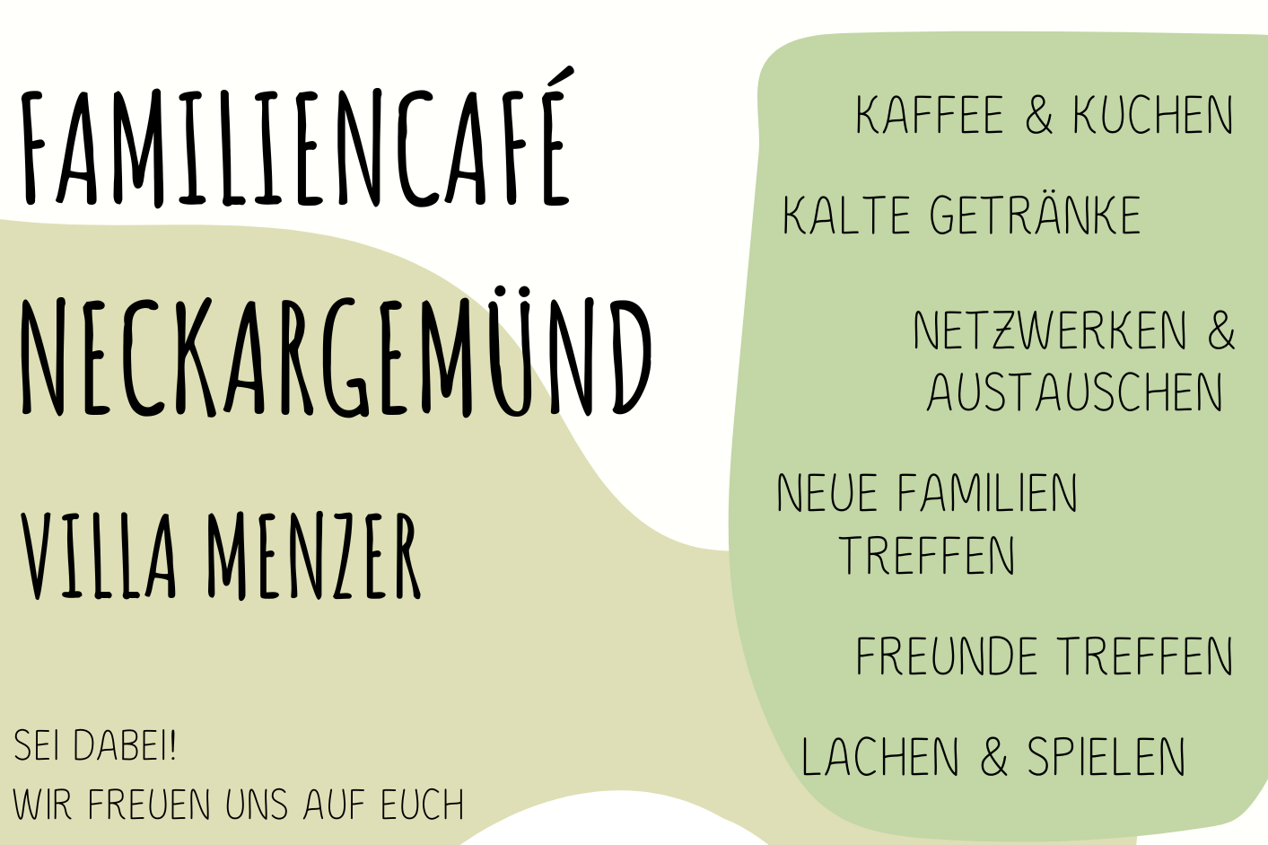 Das Familiencafé in der Villa Menzer soll nicht nur ein Ort des Zusammentreffens für Eltern und Kinder sein, sondern auch ein Netzwerk für Familien in Neckargemünd schaffen. Hier können sich in gemütlicher Atmosphäre Familien treffen oder auch neu kennenlernen, Erfahrungen austauschen oder einfach nur Kaffee und Kuchen genießen.