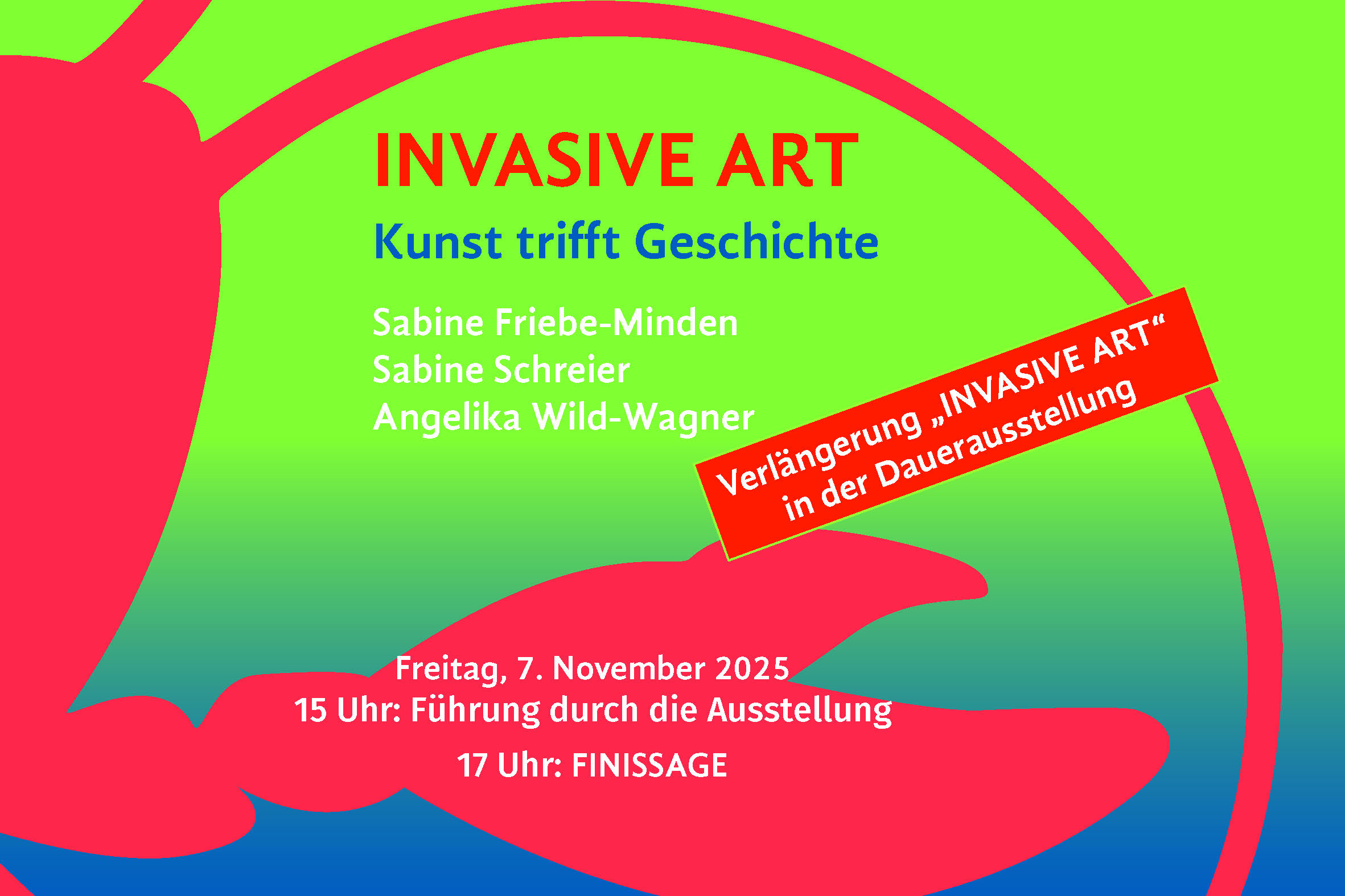 Zum Abendbummel lädt das Alte Rathaus ab 15 Uhr zur letzten öffentlichen Führung durch die Sonderausstellung „Invasive Art“, realisiert durch die drei Künstlerinnen Sabine Friebe-Minden, Sabine Schreier und Angelika Wild-Wagner. Anlässlich der Finissage der Ausstellung, die ab 17 Uhr begangen wird, erhalten alle Besuchenden ein Glas Sekt zum gemütlichen Ausklang der Ausstellung. Außerdem darf mit der Kulturreferentin Dr. Jasmin Hettinger und den Künstlerinnen auf die Verlängerung der Sonderausstellung in den Räumen der Dauerausstellung angestoßen werden: Dank der überwältigend positiven Rückmeldungen der Besuchenden wurde beschlossen, die in die stadtgeschichtliche Dauerausstellung integrierten Kunstwerke noch bis ins nächste Frühjahr hinein zu zeigen. Wenn das mal kein guter Grund zum Anstoßen ist!