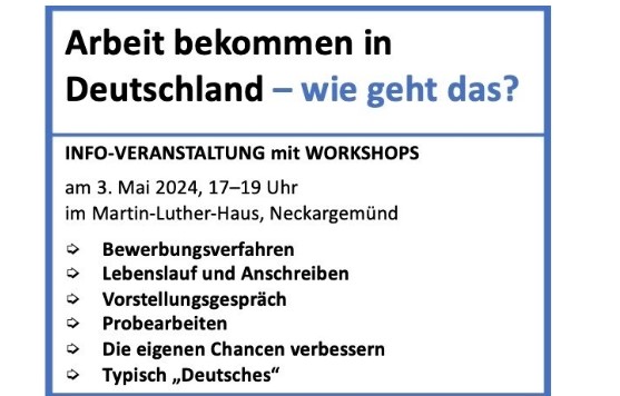 Die Themen Bewerbung, Erstellen eines Lebenslaufes, Vorstellungsgespräch etc. bedürfen für viele noch intensiver Unterstützung, so die Analyse der Ukrainehilfe Neckargemünd. Aus diesem Grund veranstaltet die Ukrainehilfe in Zusammenarbeit mit dem Integrationsmanagement der Stadt einen Infoabend mit Workshops am 03. Mai 2024 ab 17 Uhr im Martin-Luther-Haus. An diesem Abend werden führende Personen von Arbeitsvermittlern sowie eine Arbeitsvermittlerin des Jobcenter Rhein-Neckar-Kreis Vorträge halten. Gemeinsam mit erfahrenen Managern mit Personalerfahrung werden Workshops und Beratung zu allen wichtigen Themen rund um Bewerbung und Arbeit angeboten.