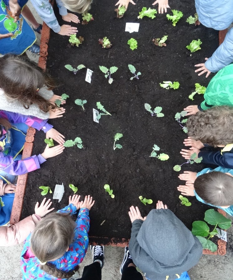 In der kleinen Kennlernrunde wurden die einzelnen Pflanzensamen und Setzlinge besprochen. Anschließend ging es auch schon mit Gartenschürze und viel Vorfreuder an das Gemüsebeet. Für jede Pflanze wurde ein Loch mit der Hand ausgehoben und dann die Setzlinge nach einander eingesetzt.
