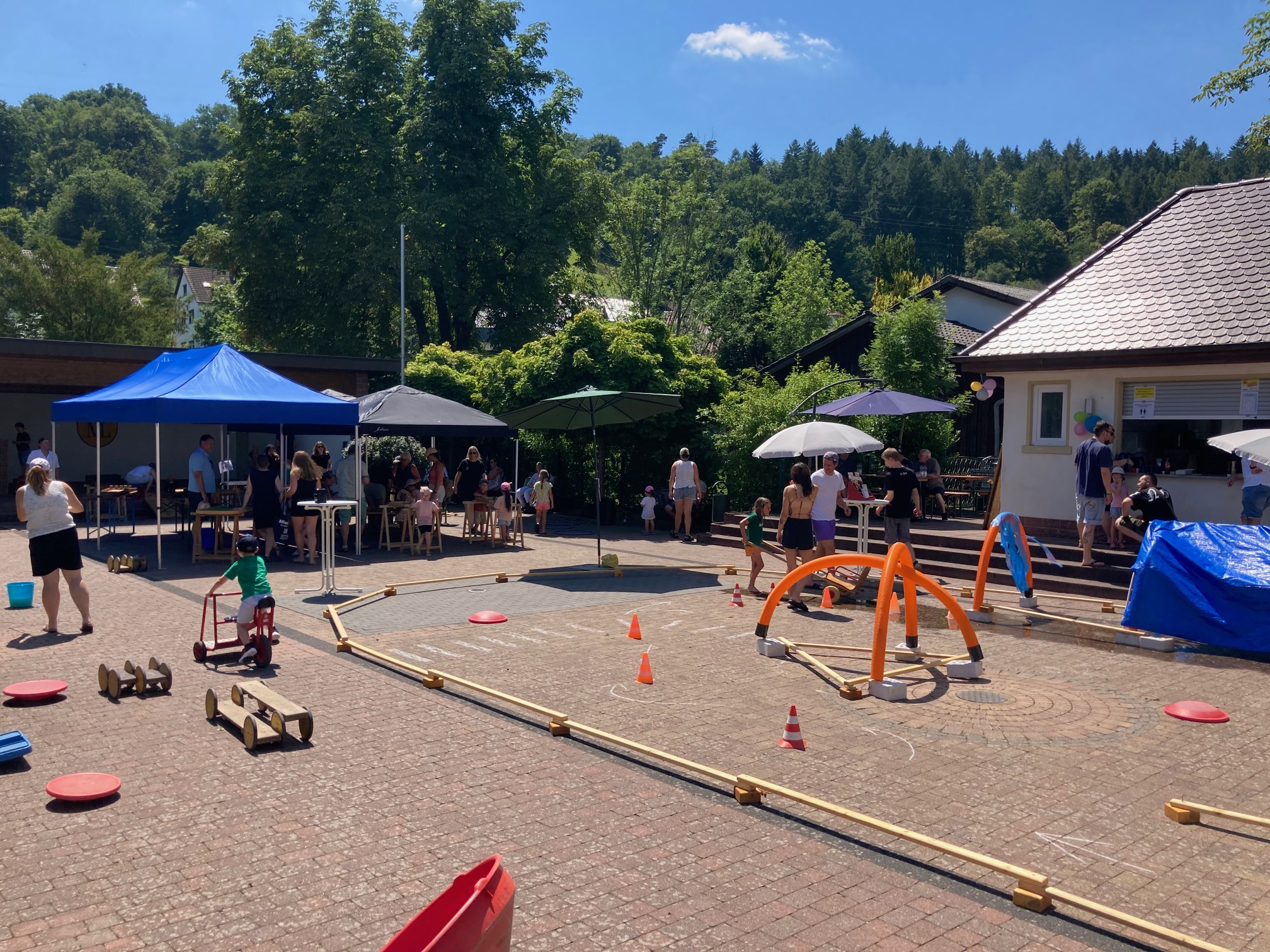 Aus der Erfahrung ersten Spielfestes heraus brachten die Leute vom Spielmobil auch Angebote für kleinere Gäste mit. Ein Parcours, der mit Bobbycars und anderen Fahrzeugen befahren werden konnte, wurde aufgebaut. Dieser Parcours entwickelte sich im Laufe des Nachmittags zum Renner. Rot-weiße Hütchen waren zu umfahren, Fußgängerüberwege zu beachten und durch die Einbahnstraßenregelung, landeten die Fahrer mit ihren Fahrzeugen zwangsläufig in einer Waschanlage. Diese wurde des heißen Wetters geschuldet tatsächlich mit erfrischendem Nass betrieben. Daraus entwickelte sich im Laufe des Nachmittags die Erfrischungszone des Festes. Kaum ein Kind blieb dabei trocken. Durchnässte Kleidung und quietschende Sandalen das Ergebnis der vielen Fahrten durch die Waschanlage. Fußgänger waren zum Ende jedoch in der Erfrischungszone in der Überzahl.