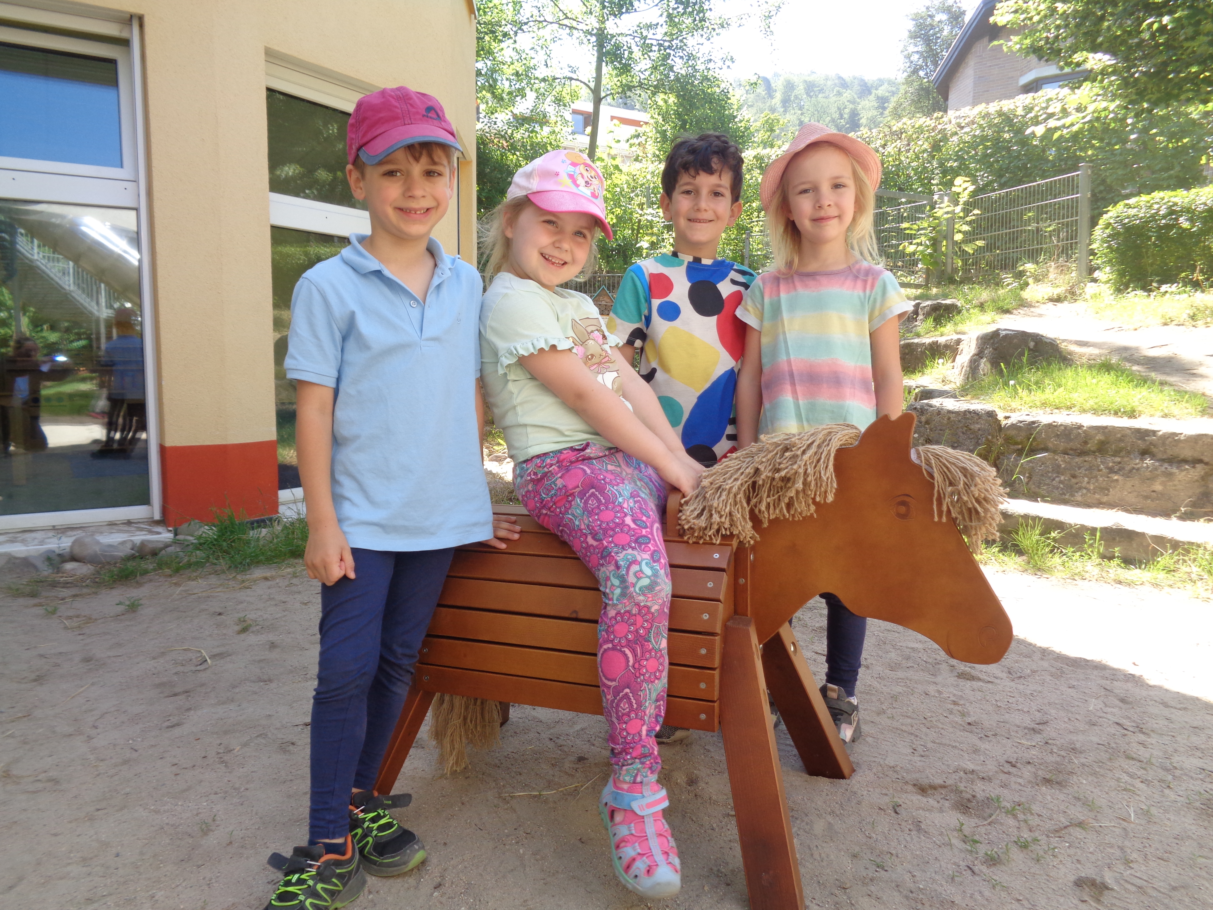 Mit dem Regionalen Förderprogramm werden Kindergärten und Kinderkrippen im Geschäftsgebiet der Volksbank Neckartal eG aus den Reinerträgen des Gewinnsparvereins e.V. unterstützt. Dadurch erhalten die Kindertageseinrichtungen des Geschäftsbezirks alle zwei Jahre eine Spende aus den Mitteln dieses Vereins. Dank dieser finanziellen Förderung in Höhe von 550,- Euro konnte heuer ein neues Spielgerät für das Außengelände der Kindertagesstätte Wiesenbacher Tal angeschafft werden: ein Outdoor-Pony. Dieses ist für die kleinen und großen Reiter stabil, sicher, robust und wetterfest und bietet Platz für bis zu zwei Kinder. Mit diesem Erwerb trägt die Volksbank Neckartal zur Bereicherung des Spiel- und Bewegungsangebotes im Außenbereich bei, wofür das Kollegium auch im Namen der Kinder herzlich dankt.