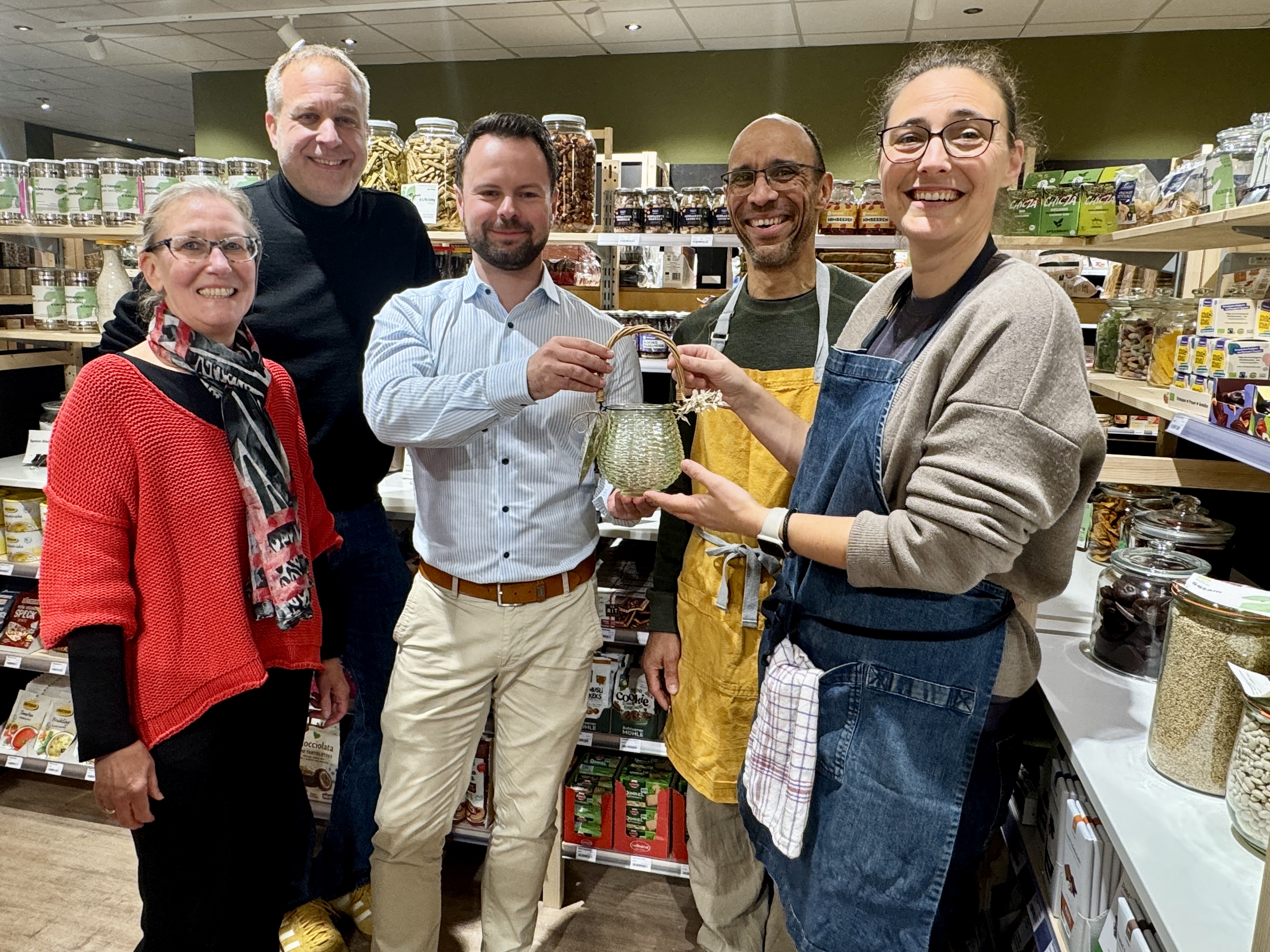 Der Bioladen Naggisch ist umgezogen und hat im Pflughof über dem Parkhaus in Neckargemünd seinen neuen Platz gefunden. Bürgermeister Jan Peter Seidel, Steffen Wachert vom Gewerbeverein und Petra Holzer vom Stadtmarketing besuchten im Oktober die Inhaberinnen, um sich ein Bild von den neuen Räumlichkeiten und dem erweiterten Angebot zu machen.