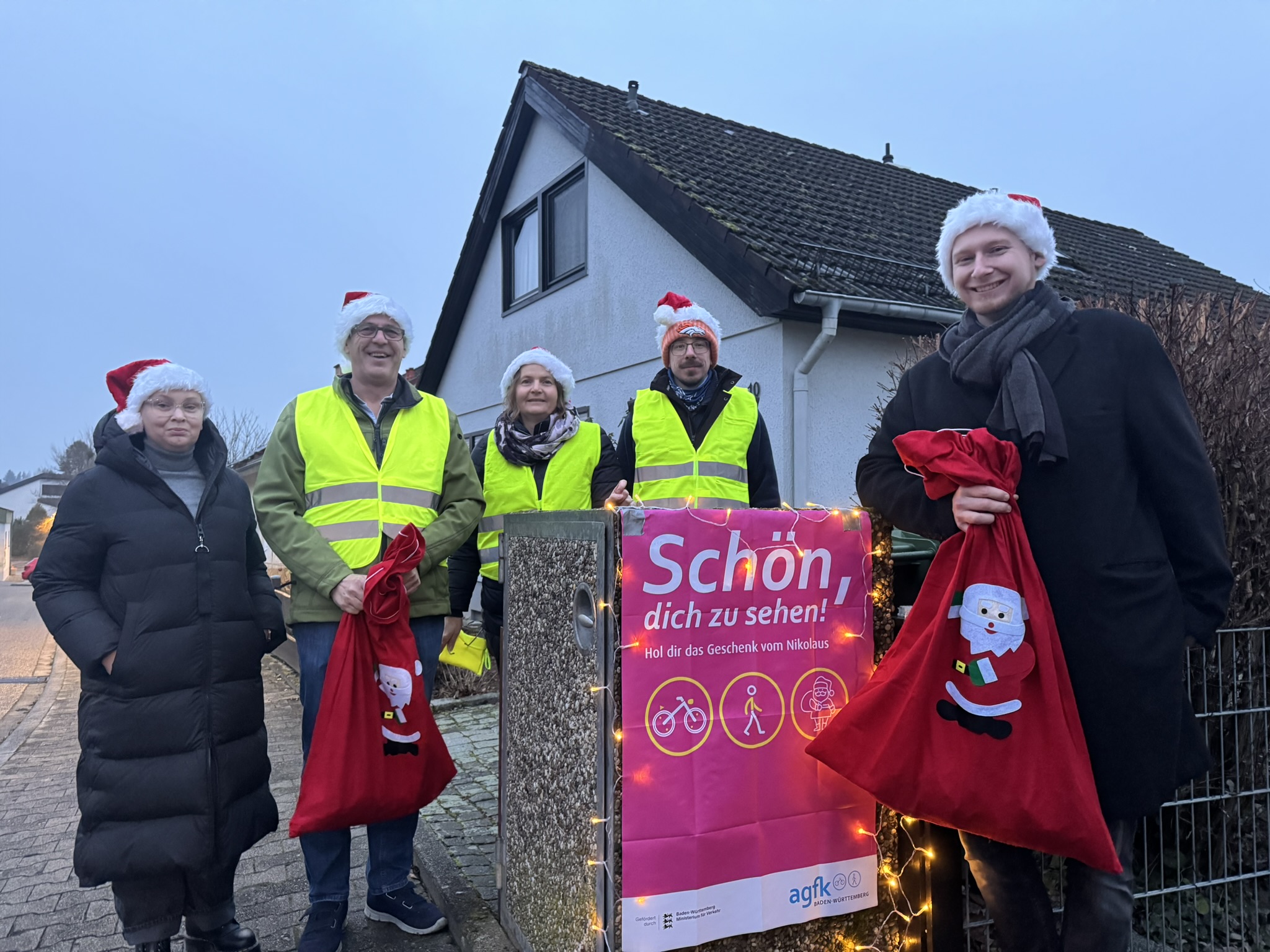 Hintergrund: Die Nikolaus-Aktion setzt die AGFK-BW seit 2015 gemeinsam mit ihren Mitgliedern zum Thema „Verkehrssicherheit“ um. Unter dem Motto „Schön, dich zu sehen!“ verteilen Bürgermeisterinnen, Bürgermeister und kommunale Mitarbeitende kleine Aufmerksamkeiten an alle, die sich auch in der dunklen Jahreszeit für eine aktive, gesunde und nachhaltige Mobilität entscheiden. Die Nikolausaktion findet in der ersten Dezemberwoche in 49 Kommunen in Baden-Württemberg statt.