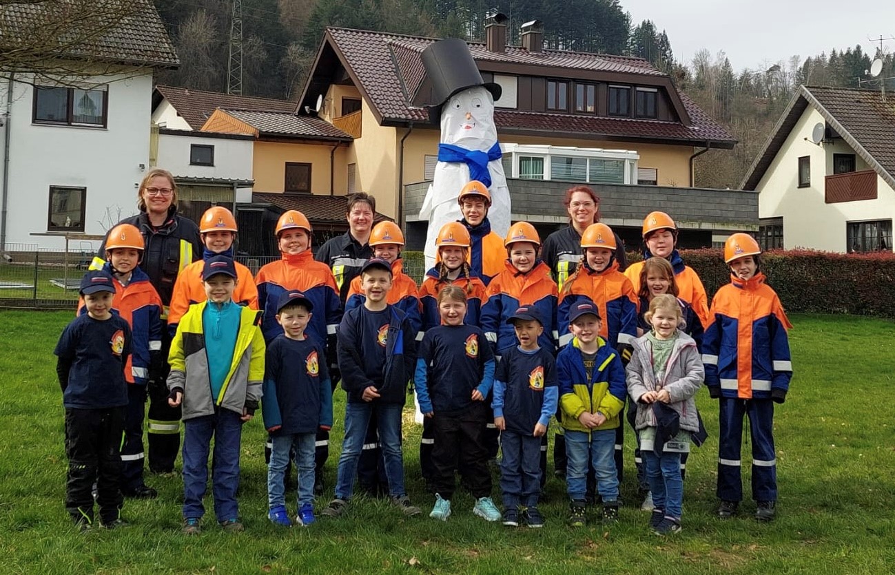 Bereits freitags vor Lätare begannen die Vorbereitungen für den traditionsreichen Sommertagszug im Neckargemünder Stadtteil. Mitarbeiter der technischen Dienste hatten die Butzen, die Winter und Sommer symbolisieren aus ihrem Winterquartier hervorgeholt und beim Feuerwehrhaus stationiert. Genau der richtige Ort damit die Kinder der Jugendfeuerwehr und die FeuerMücken sich ans Schmücken der mit Stroh und Tannenzweigen bestückten Rohlinge begeben konnten. Papierblumen und Girlanden ergänzten, die von Schülerinnen und Schülern der Erich-Kästner-Schule vorbereiteten Butzen, und machten aus den tristen Figuren ansehnliche Repräsentanten der Jahreszeiten. Gut versteckt harrten diese dann der Dinge. Schon am Sonntag in aller Frühe ging das emsige Treiben der Jugendfeuerwehr weiter. Der Schneemann, der am Nachmittag in Flammen aufgehen sollte, musste aufgebaut werden. Viel Stroh in Papiertischdecken gehüllt bildeten das Grundgerüst. Ein schwarzer Zylinder obendrauf, gemalte Kohleknöpfe und ein Gesicht mit orangenfarbener Karotte vollendeten das Kunstwerk. Eine Absperrung und ein parat gelegter Wasserschlauch sicherten die Feuerstelle ab.