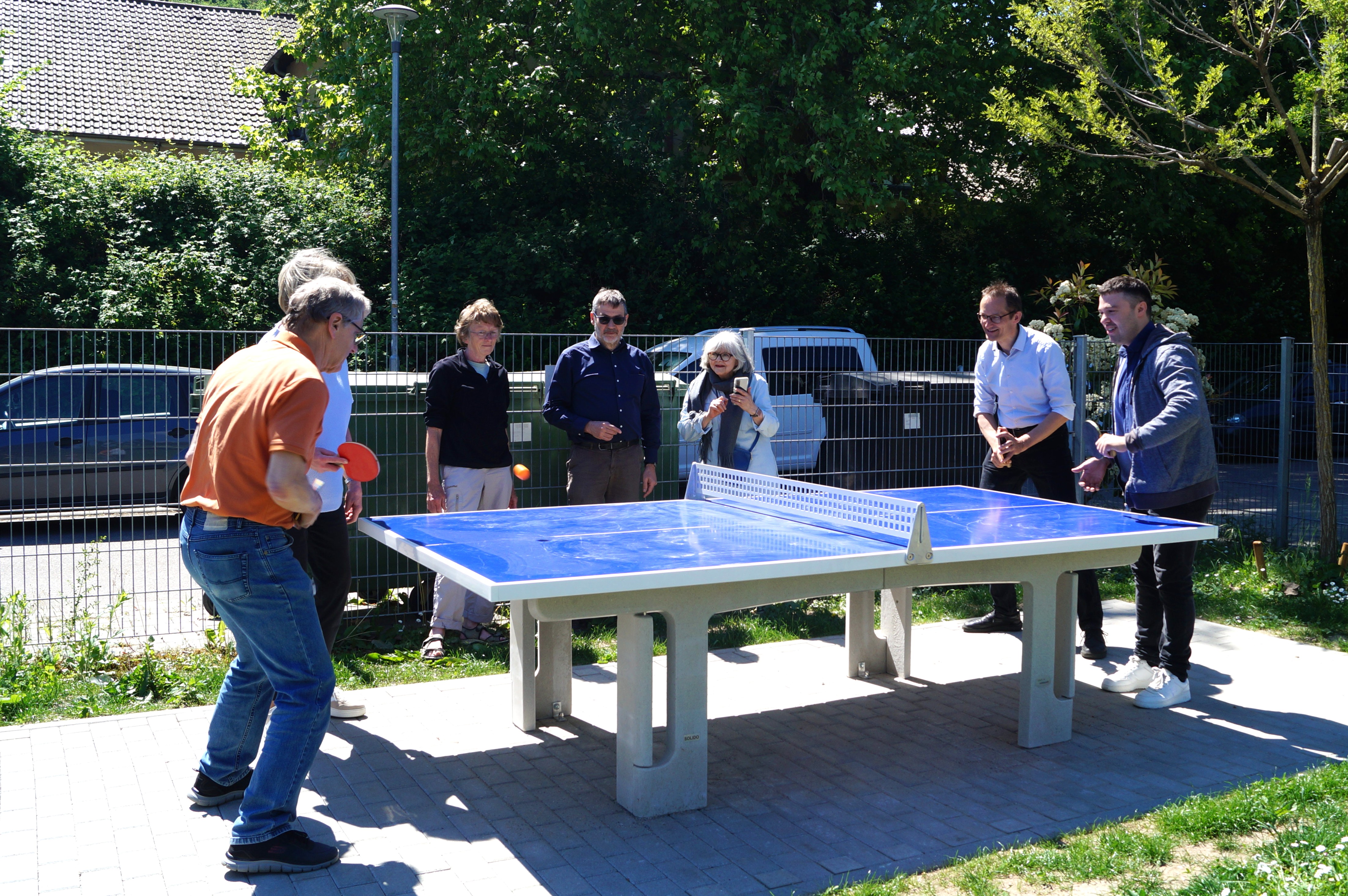 Bei strahlendem Sonnenschein wurde die Platte direkt mit einer ersten Runde Tischtennis eingeweiht. Damit der Spielspaß lange anhält, brachte der stellvertretende Bürgermeister zusätzlich zwei komplette Spielsets und zahlreiche Ersatzbälle für die Bewohnerinnen und Bewohner mit.