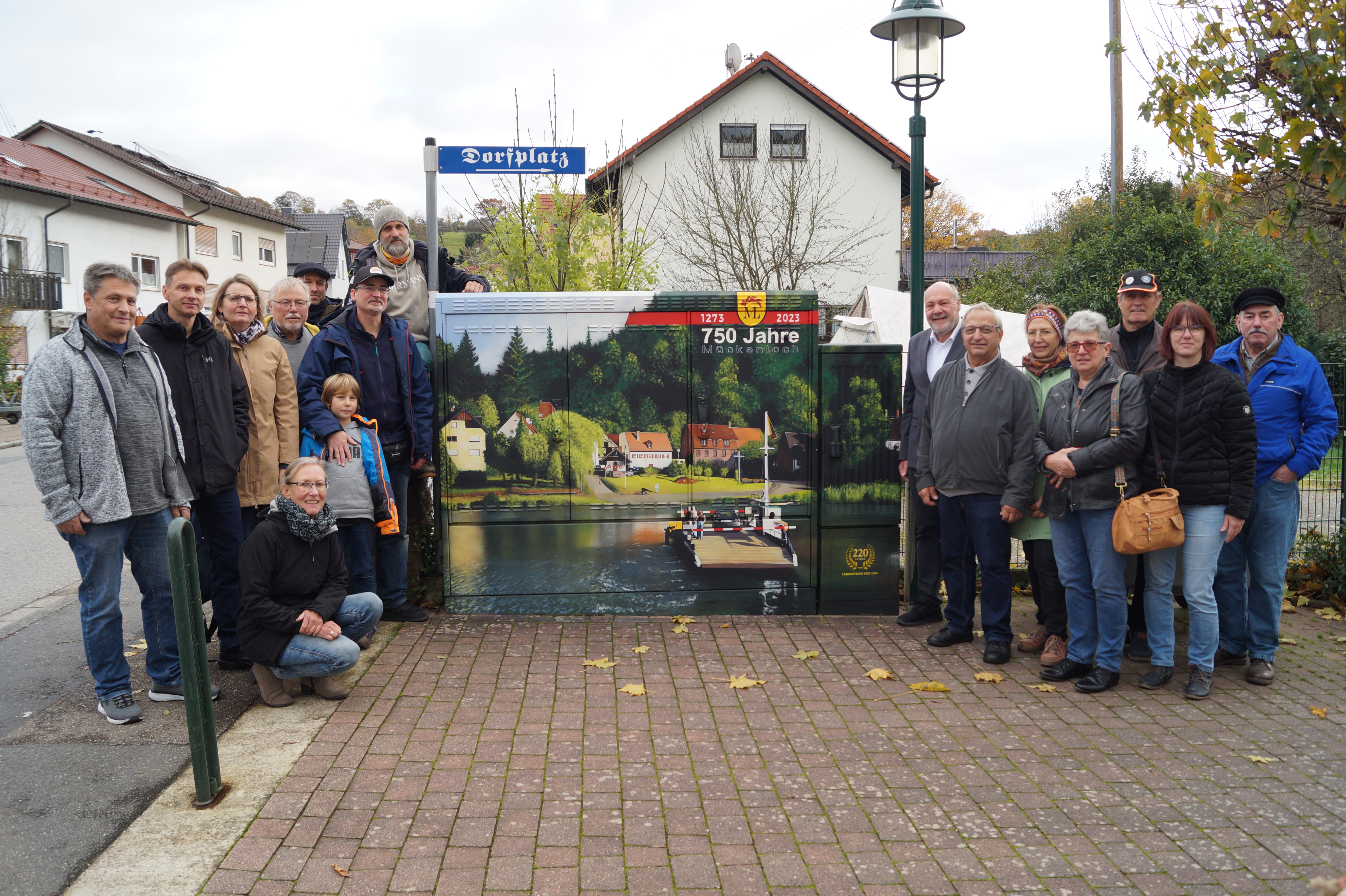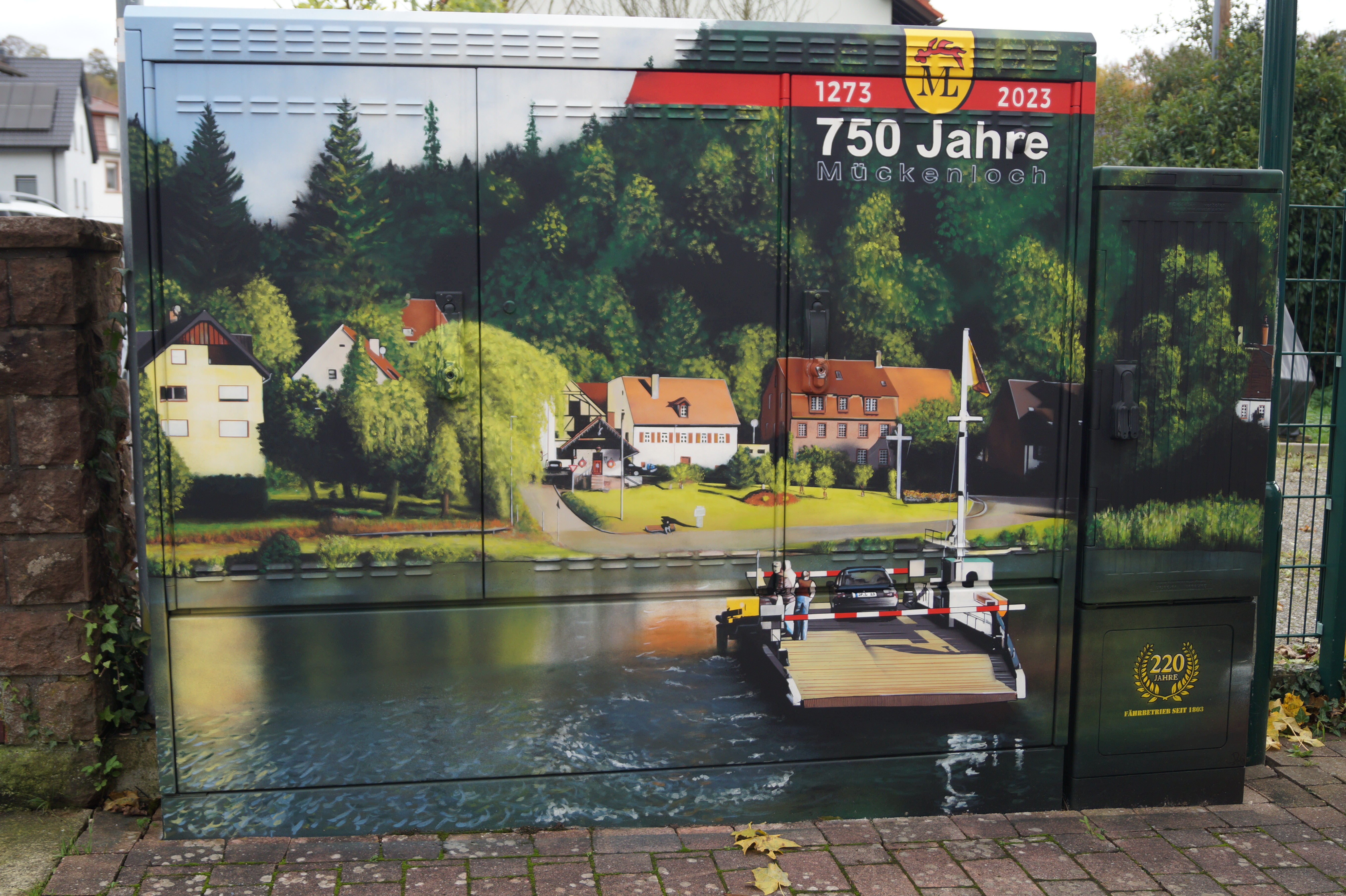 Nach ungefähr 90 Stunden Arbeit an diesem Bild der Fähre vor der Kulisse des Neckarhäuserhofs konnte Jens-Peter Lages kürzlich den Verteilerkasten in Mückenloch am Dorfplatz fertigstellen. Am Freitag, den 10. November trafen sich daher Bürgermeister Frank Volk, Ortsvorsteher Joachim Bergsträsser, Ortschaftsrätinnen und Ortschaftsräte aus Mückenloch, die Fährmänner, Mitglieder des Freundeskreis Fähre Neckarhausen-Neckarhäuserhof e.v. und Mitarbeiterinnen der Stadt mit Herrn Lages zur feierlichen Übergabe diese Kunstwerkes. „Hier hat der Ortschaftsrat ein tolles Motiv gefunden, das vom Künstler perfekt umgesetzt wurde“ sagte Frank Volk und freute sich, dass das Projekt „Verteilerkasten“ auch in der Bevölkerung stets so viel Anklang findet und zu einem ortsteilübergreifenden Projekt wurde.