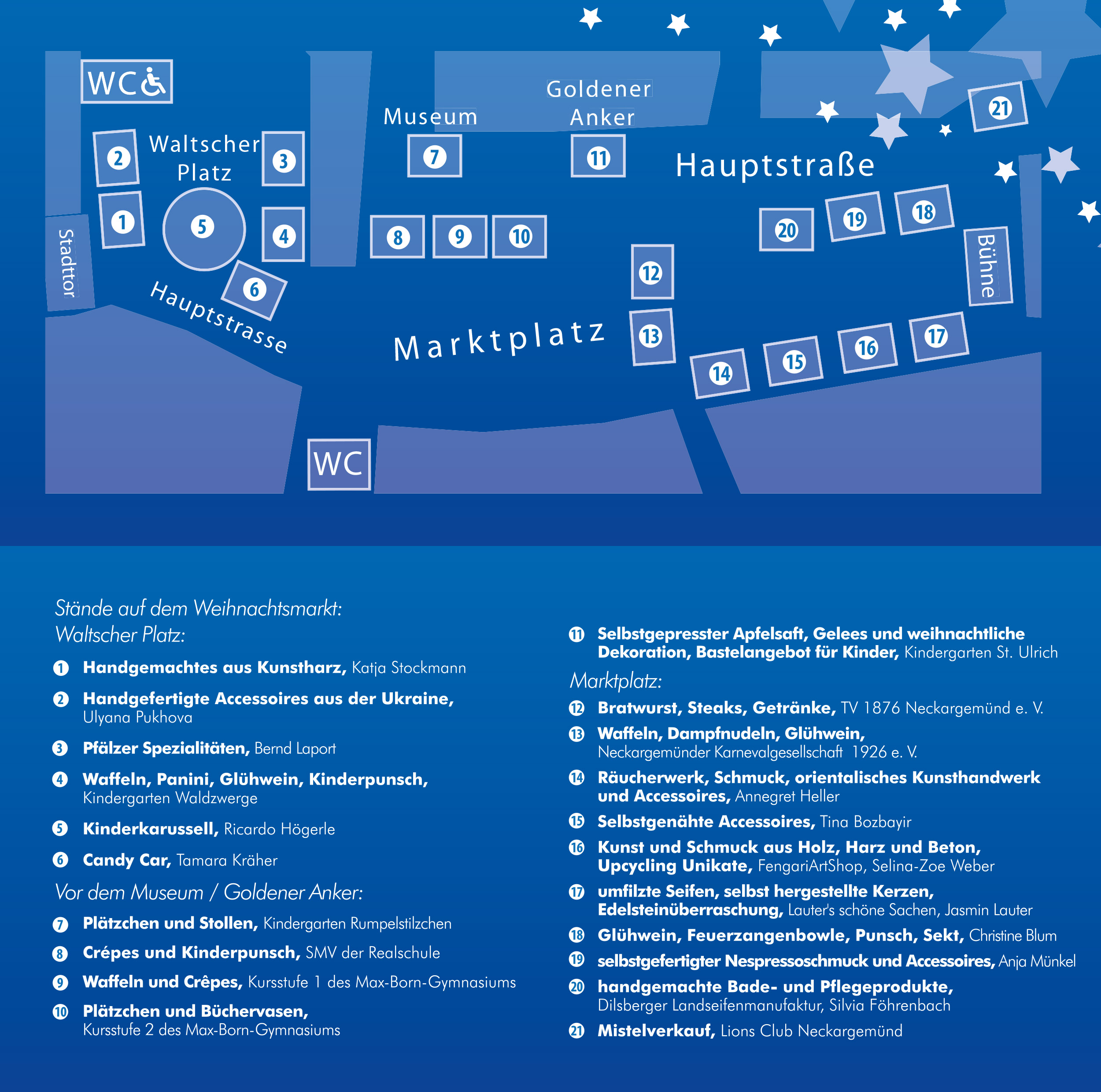 Es wird wieder viele Stände mit allem, was zu Weihnachten dazu gehört, geben. Lokale Kunsthandwerker, Vereine, Kindergärten, Schulen und Geschäfte bieten allerlei Handgemachtes und Leckereien an, von Kerzen und Schmuck, auch aus besonderen Materialien, bis hin zu handgemachten Accessoires, Seifen und weihnachtlichen Deko-Artikeln. Bürgermeister Jan Peter Seidel weiß diese lokale Beteiligung sehr zu schätzen: „Besonders freut mich, dass sich die örtlichen Kindergärten, Schulen und Vereine sowie Gewerbetreibenden bei diesem Weihnachtsmarkt einbringen. So entsteht ein wunderbarer Markt von Neckargemündern für Neckargemünder und alle Gäste mit einem einzigartigen Angebot.“
