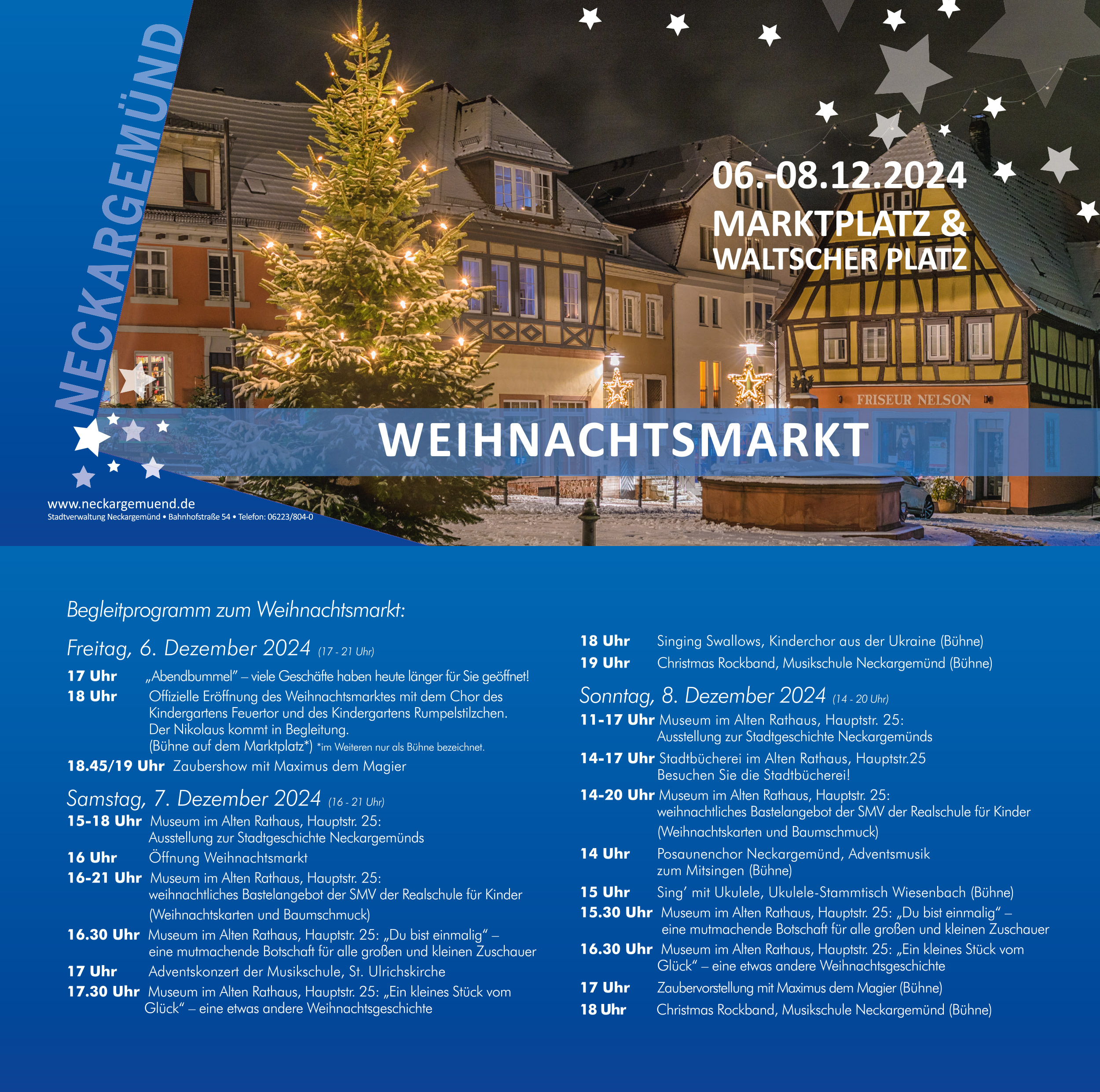 Das vielfältige Programm auf der Bühne auf dem Markplatz sorgt für weihnachtliche Stimmung: Maximus der Magier verzaubert Kinder und Erwachsene gleichermaßen, der Posaunenchor spielt Weihnachtsmusik zum Mitsingen und die Christmas Rock Band der Musikschule steht Samstag- und Sonntagabend auf der Bühne. Im Museum im Alten Rathaus warten verschiedene Bastelangebote und Theaterstücke auf die Kinder. Zudem lädt die Dauerausstellung des Museums zur Neckargemünder Stadtgeschichte zum Besuch ein.