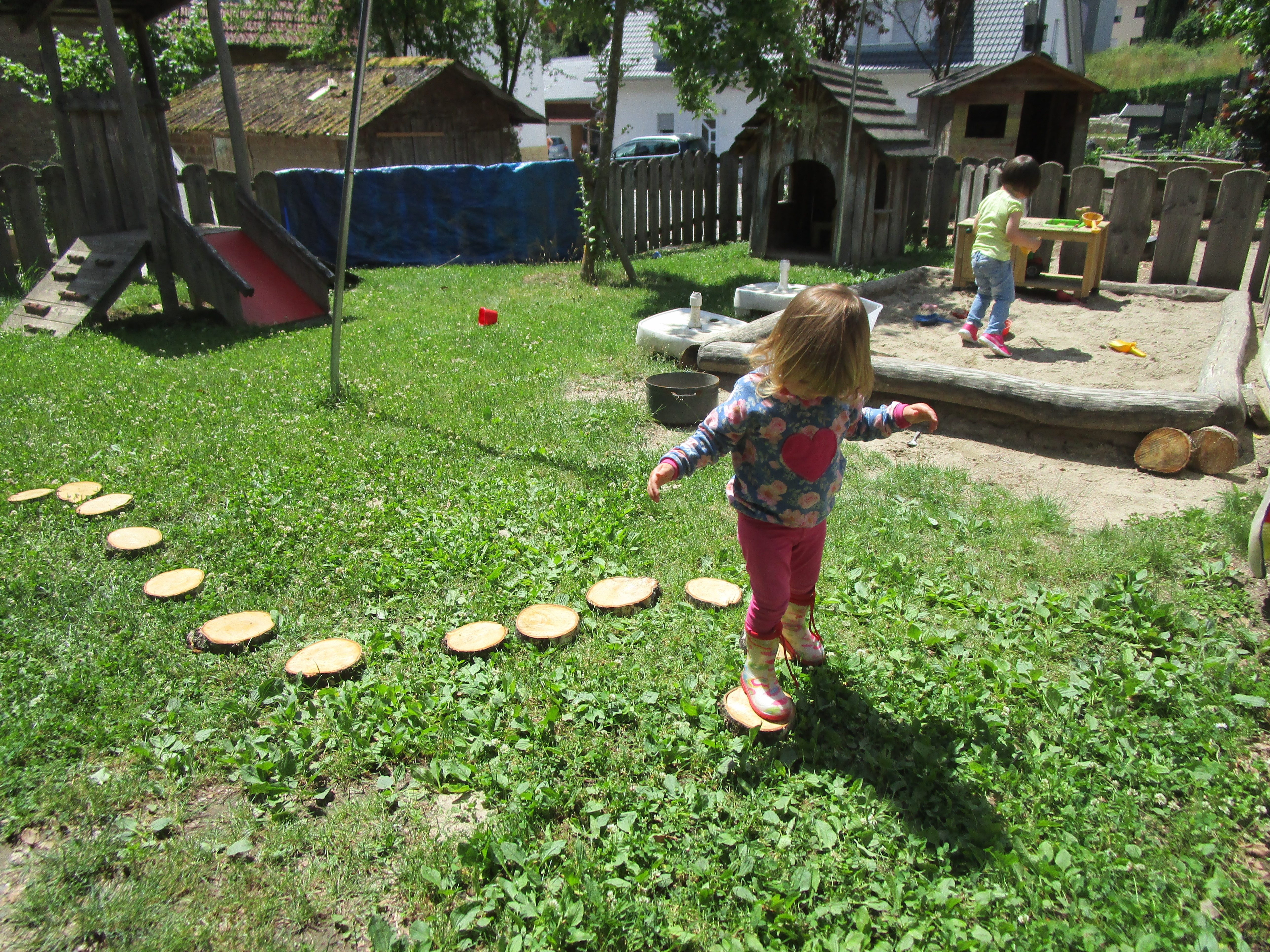 Die Gruppen haben jeweils einen eigenen Zugang zum Außenbereich des Kindergartens. Dort finden die Kinder neben Klettergerüst, Schaukel, Rutsche und Sandkasten auch ausreichend Platz zum Toben und Spielen. Die Gruppen verbringen viel Zeit im Freien und nutzen die vielfältigen Möglichkeiten in unserem eigenen Garten. Durch Ausflüge ermöglichen wir den Kindern auch regelmäßig, die Natur und ihre Umgebung zu erkunden.
